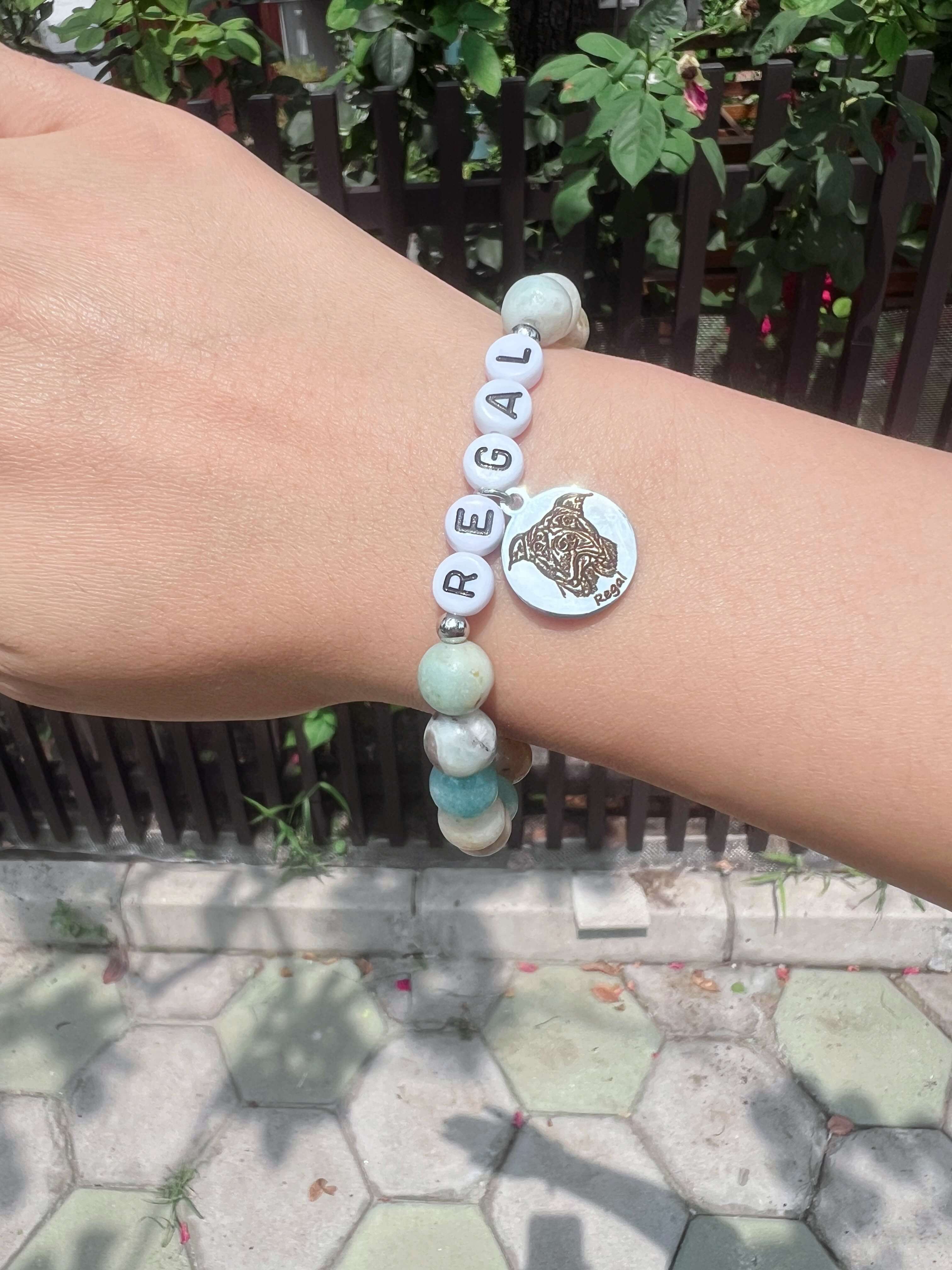 Fabriqué à la main avec soin, ce bracelet personnalisé allie pierres naturelles colorées et perles à lettres personnalisées pour capturer l'esprit unique de votre animal adoré. Sa breloque gravée transforme la photo de votre animal en un magnifique portrait, lui conférant une véritable signification.