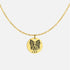Gold necklace with a round pendant worn by a person in a white shirt.