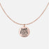 Gold necklace with a round pendant worn by a person in a white shirt.